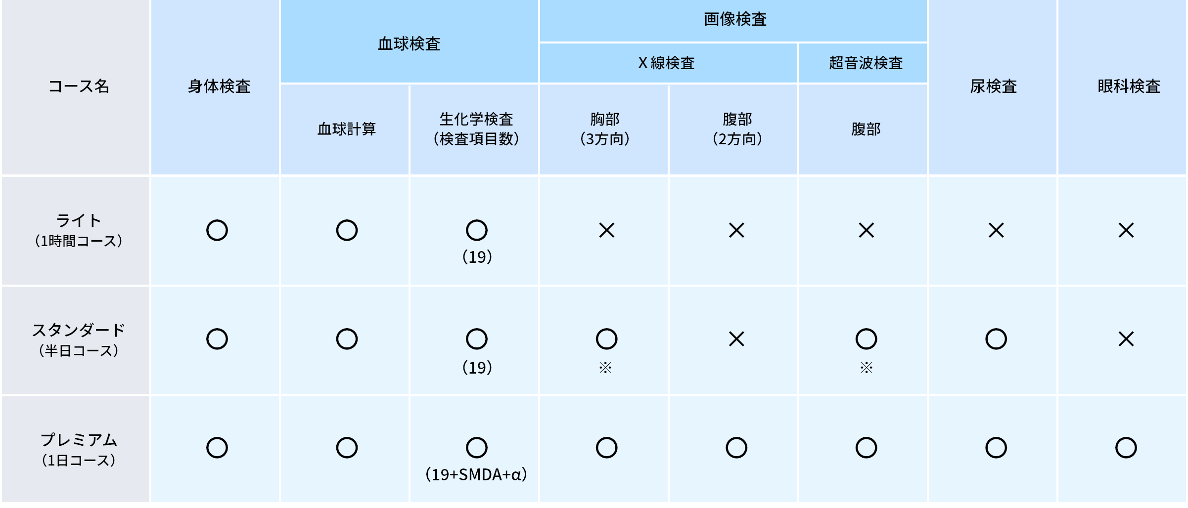 ※スタンダードコースでは胸部x線検査または腹部超音波検査のどちらかひとつをお選びできます。